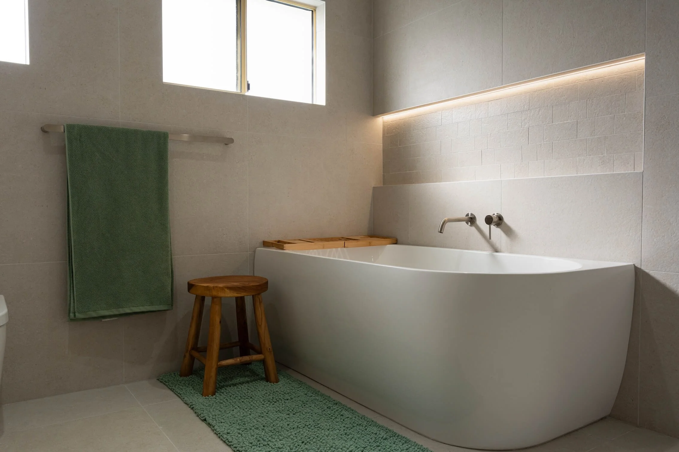 Two stylish bathrooms that redefine first impressions. With a seamless blend of natural textures and warm ambient lighting. A truly calm and natural retreat.